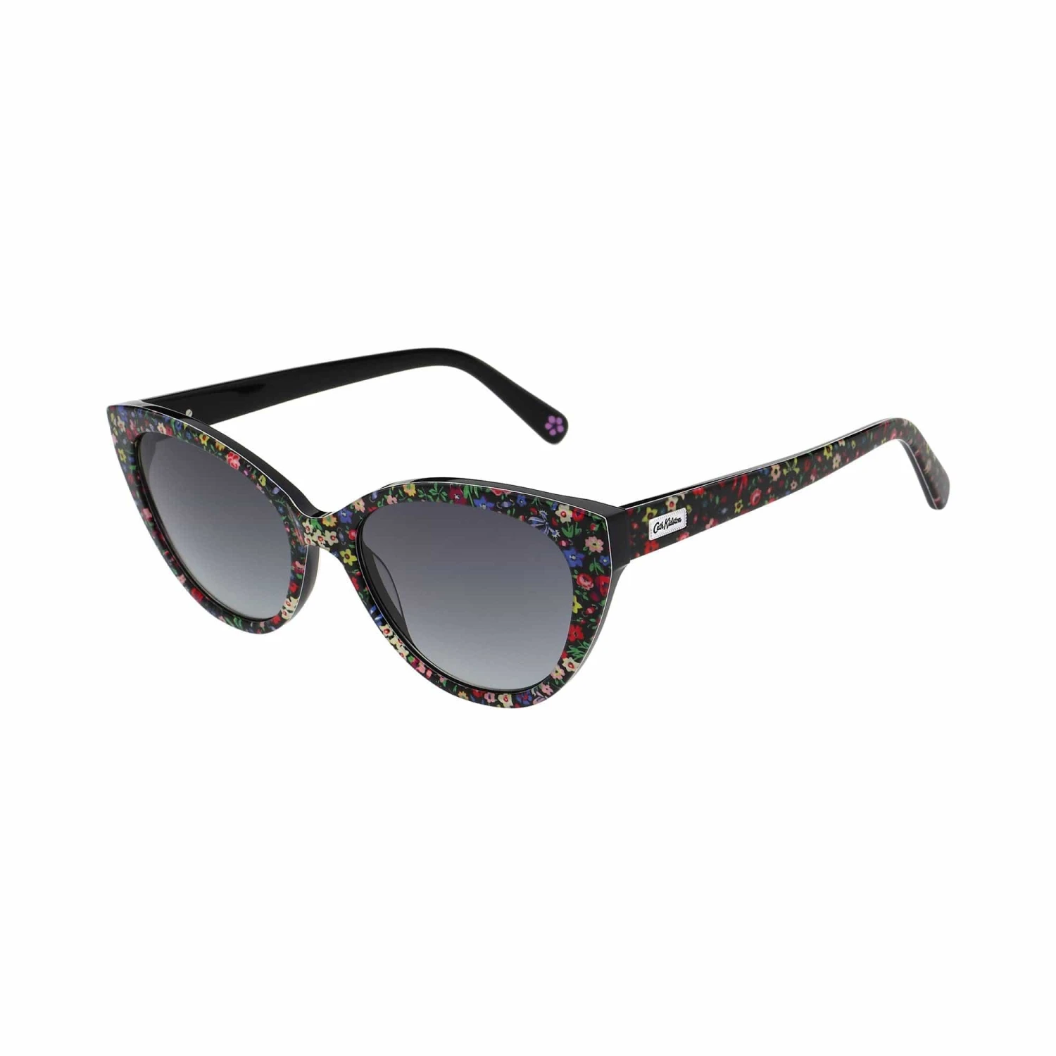 These distinctive floral sunglasses from Cath Kidston are an easy to wear soft cat eye shape. This exclusive print features beatiful multi coloured flowers on a black background and the frame has a flattering grey graduated lens.