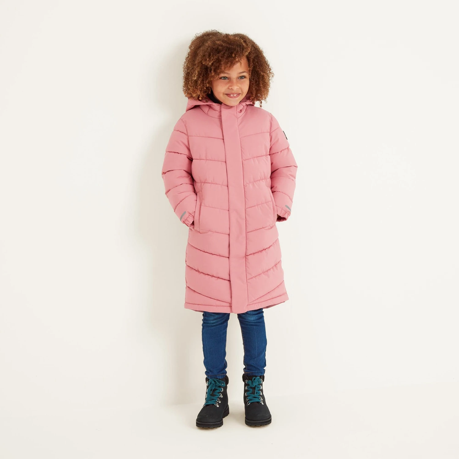 Designed by our team in West Yorkshire to stand up to the toughest winter days by keeping the wind out and the heat in, our Dollis kids coat feels so warm and cosy on it’s like wearing a duvet. This extra long coat is quilted in a chunky chevron design and is thickly padded with a warm, insulated eco filling made from recycled plastic bottles. There is a cosy fixed hood with a Velcro adjuster tab at the back for a custom fit and two lower pockets that are perfect for slipping cold hands into. Dollis is easy to get on and off thanks to a chunky two-way zip secured with press studs and Velcro, so it makes a great coat for school as well as action-packed weekends. There are neat reflective safety prints above the back hem and cuffs that stand out against car headlights for increased visibility at night and the finishing touch is an embossed rubber TOG24 Rose badge on the sleeve.