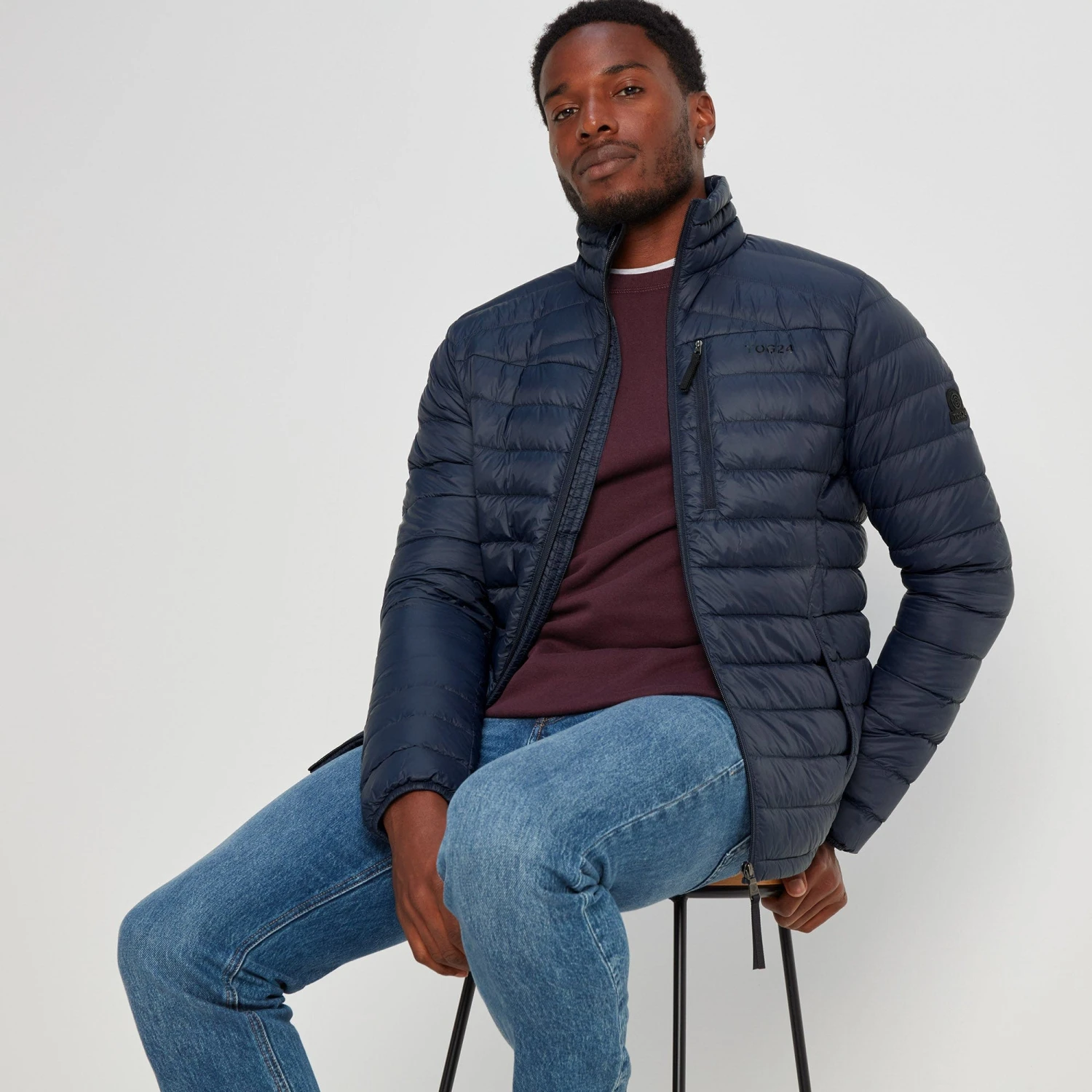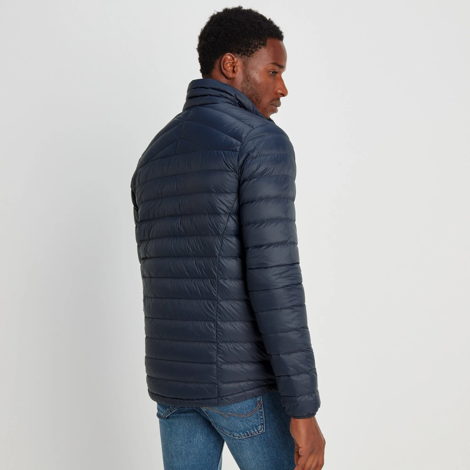 Perfect for adding a layer of warmth without any bulk, our Drax down filled mens jacket feels silky-soft, incredibly light and packs down small into a zip up inside pocket. You’ll have no trouble finding room for it in your case when you go away, and it also makes a handy travel pillow. This padded jacket gets its incredible warmth from naturally insulating duck down that traps heat without being bulky. Quilted bands, a panelled cut and a draught-busting high neck mean it feels as good as it looks, and it has thoughtful details like a soft chin cover over the top of the zip. Designed to squish down really small, then spring back into shape, Drax has roomy side pockets protected by an elasticated flap, light elastic at the cuffs and small toggle adjusters at the hem keep the chill out. Designed in Yorkshire, where we always need layers, our Drax mens jacket is ideal for wearing over a top when it’s only a bit chilly or layering under a coat when the wind is howling. Reflecting our Spen