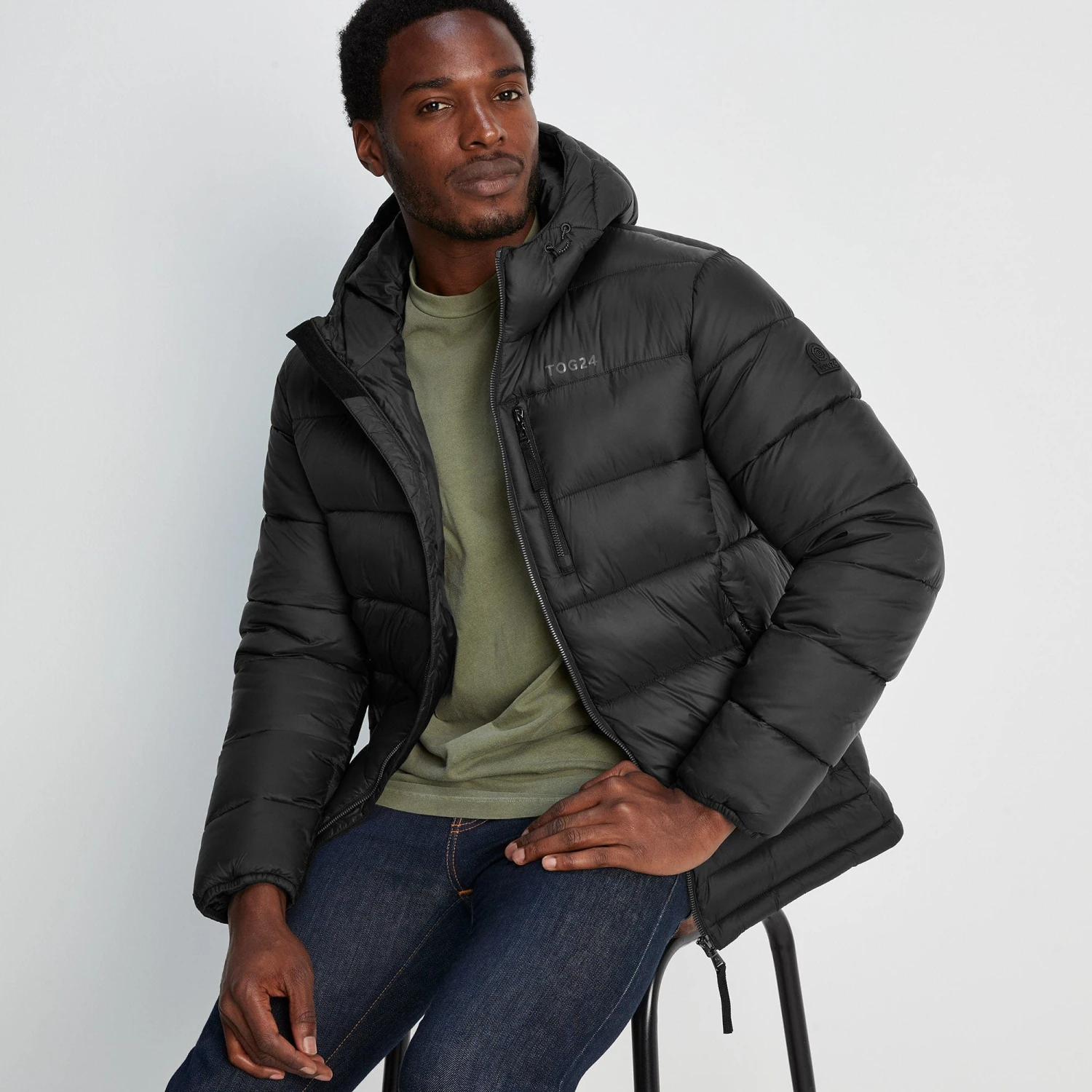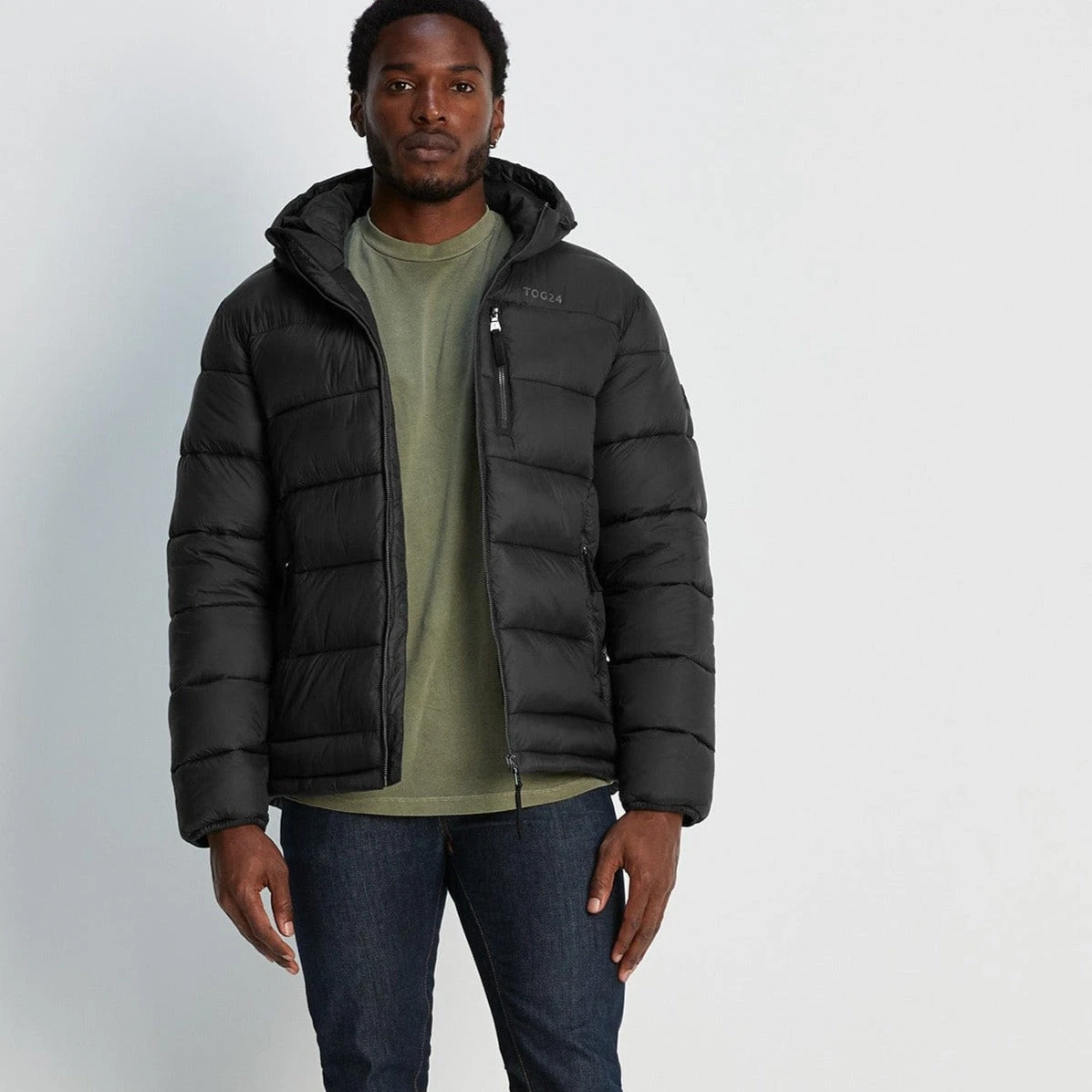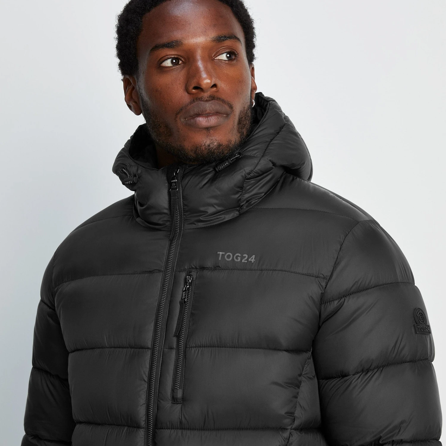 Studio model Efosa is wearing size M and is 6’1″, chest 40″, waist 31