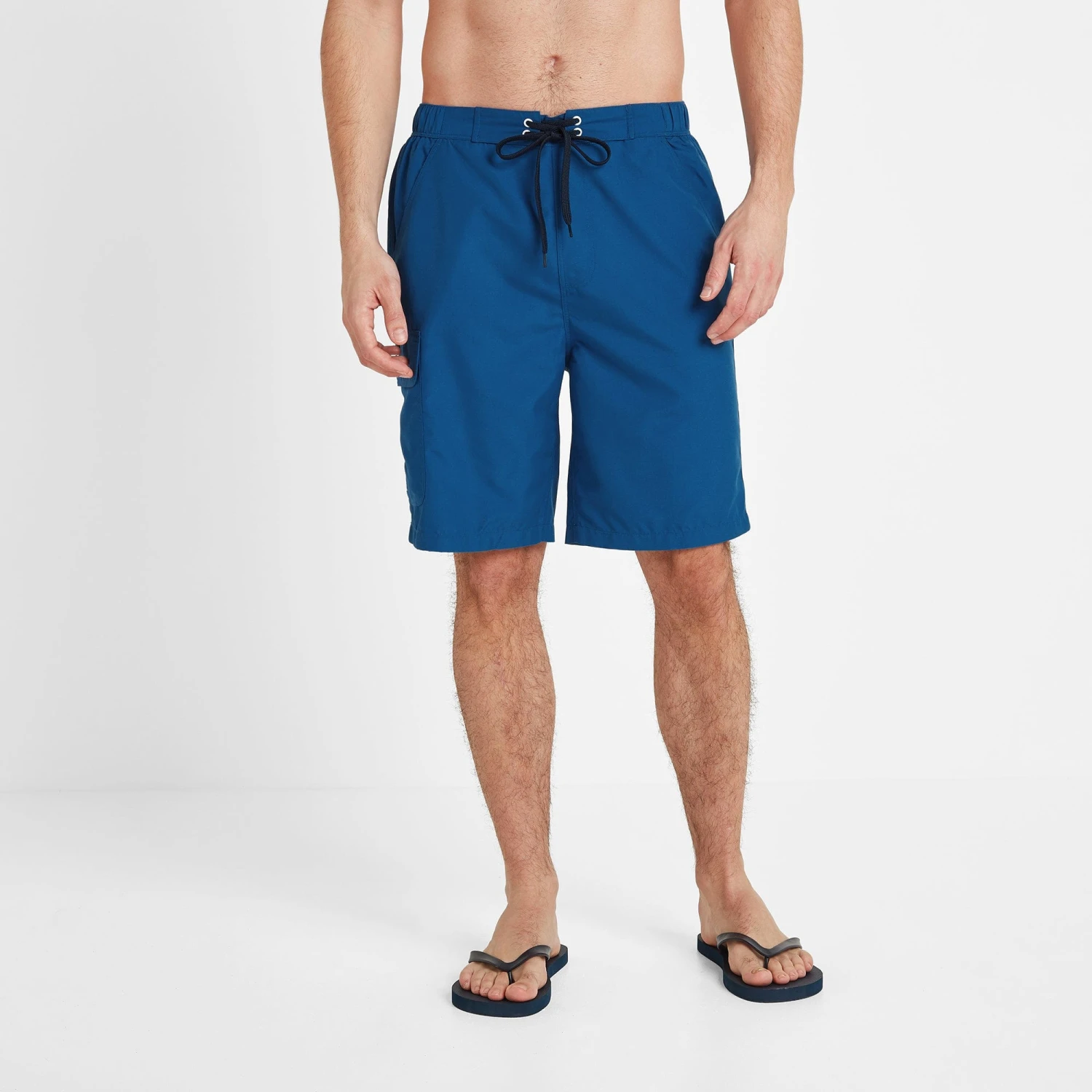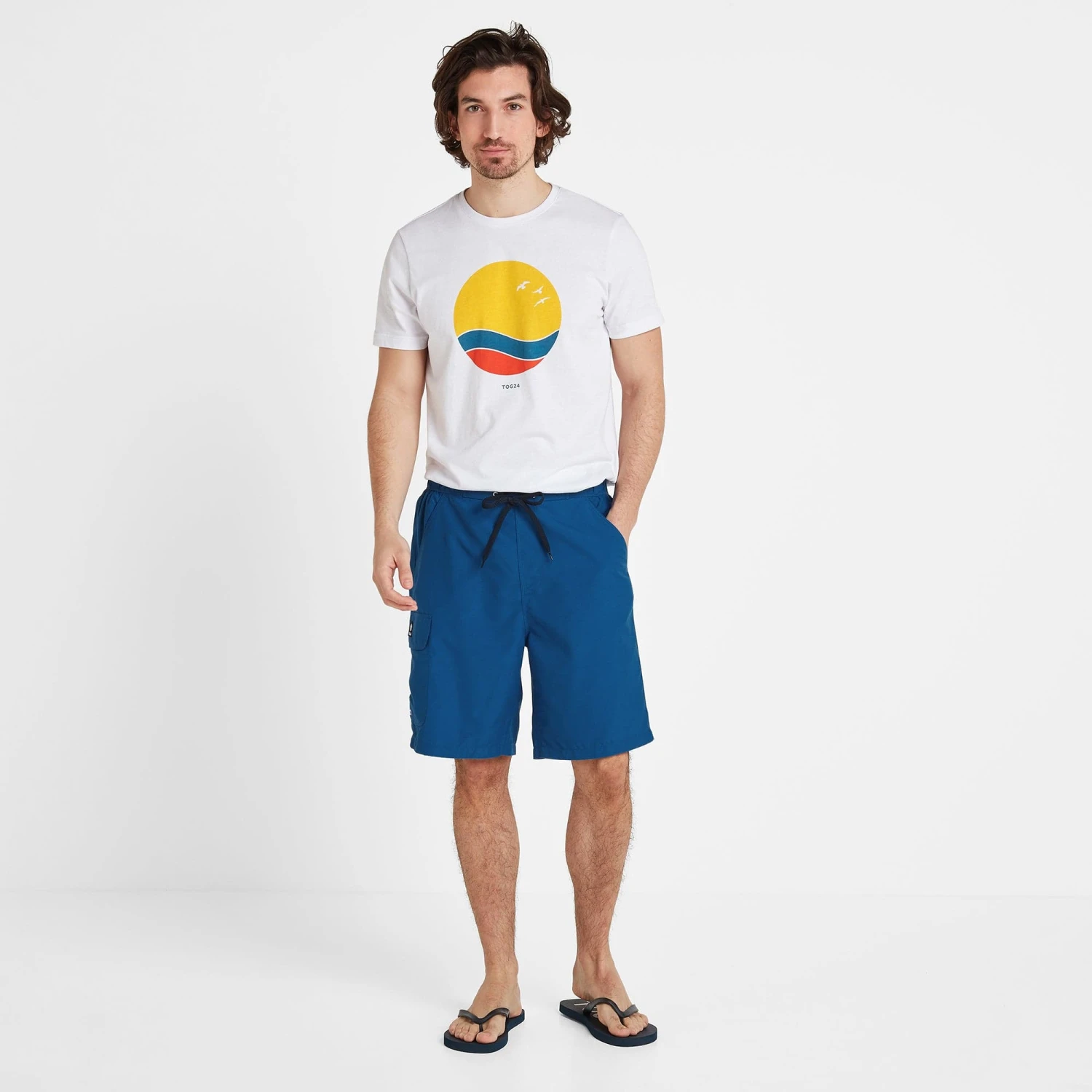 Beach huts at Whitby Bay in North Yorkshire were the inspiration for our Payne boardshorts that come in bold seaside colours. These longer length casual swimming shorts have a drawcord feature on the elasticated waistband and two angled hip pockets, giving a streamlined fit. They are also packed with practical features, such as supersoft inner mesh briefs and plenty of pockets. The fastening patch pocket on the thigh is perfect for keeping your valuables in when you’re not in the water and has an eyelet that stops the shorts filling up with water when you do take the plunge. Payne comes in a water repellent fabric that is made from 100% recycled material, so when you choose them, you’ll be doing your bit to protect the planet. The finishing touch is a branded embroidered Yorkshire Rose badge on the flap of the patch pocket heralding our Truth over Glory ethos.